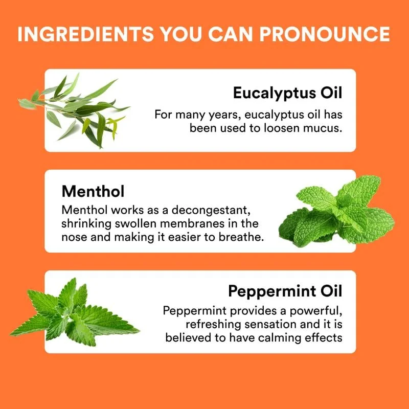 Ingredients: Eucalyptus, Peppermint, Menthol, and other essential oils