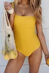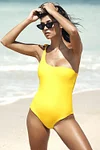 Charming one piece bathing suit in solid color, details include single shoulder with tied shoulder strap, removable pad cups, and brief cut bottom with cheeky coverage back. Designed in a stretch nylon and spandex material.